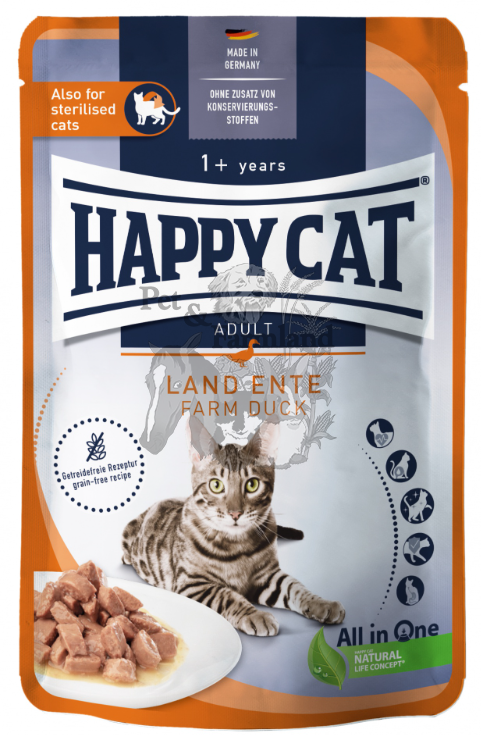 A Happy Cat Meat in Sauce mit Land-Ente gondosan kerül elkészítésre, értékes hússal és ízletes szósszal. Ez a finom eledel támogatja a húgyúti rendszert, és minden ínyencet kényeztet. Ezért ez az ízletes táplálék ivartalanított macskáknak is alkalmas.